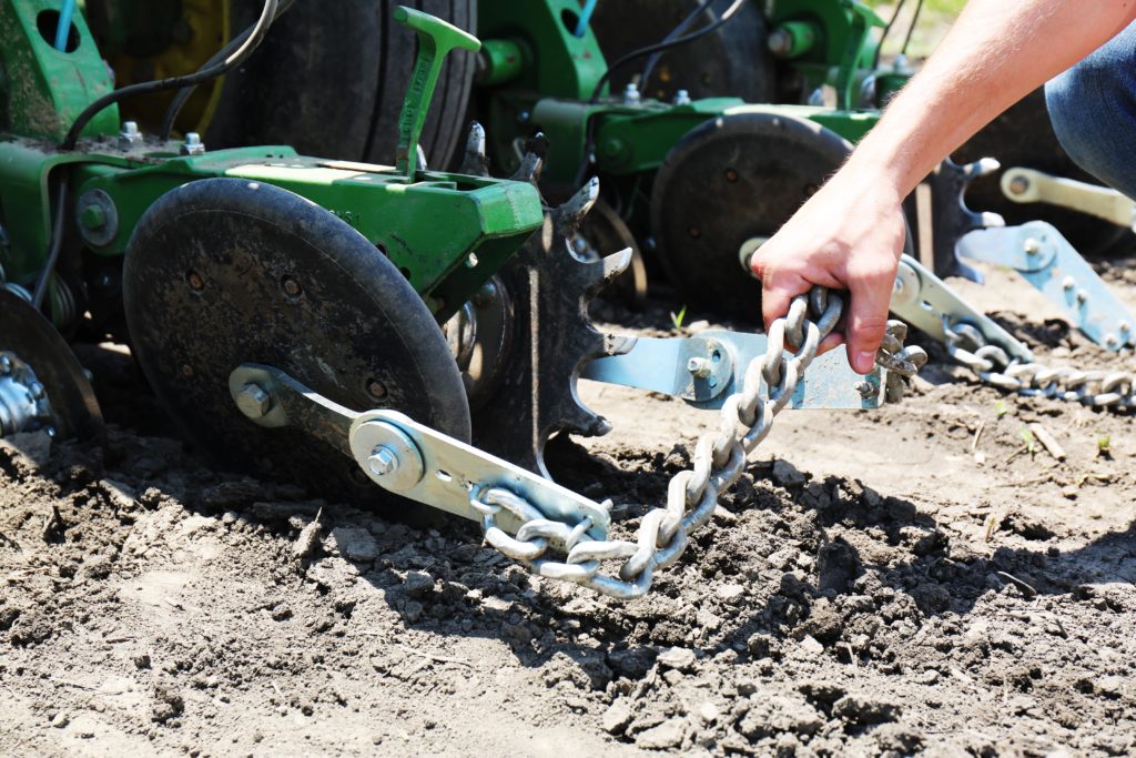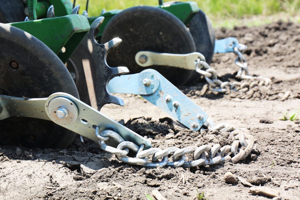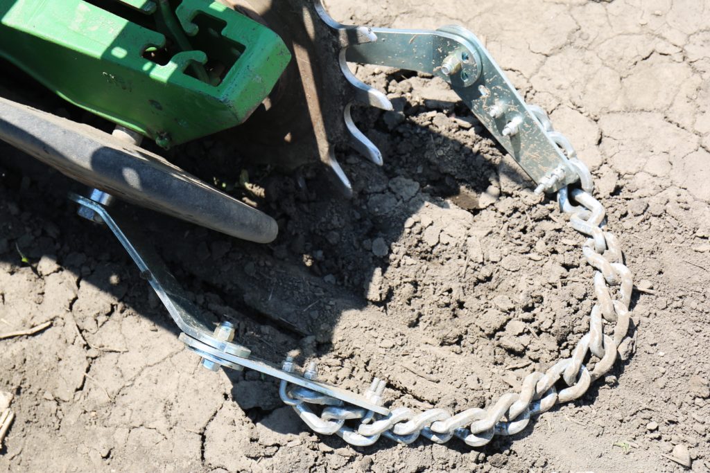 Heavy duty square edge drag chain. Some planters require drilling a hole. The drag chains even out the soil surface above the seed zone and allow more even drying.